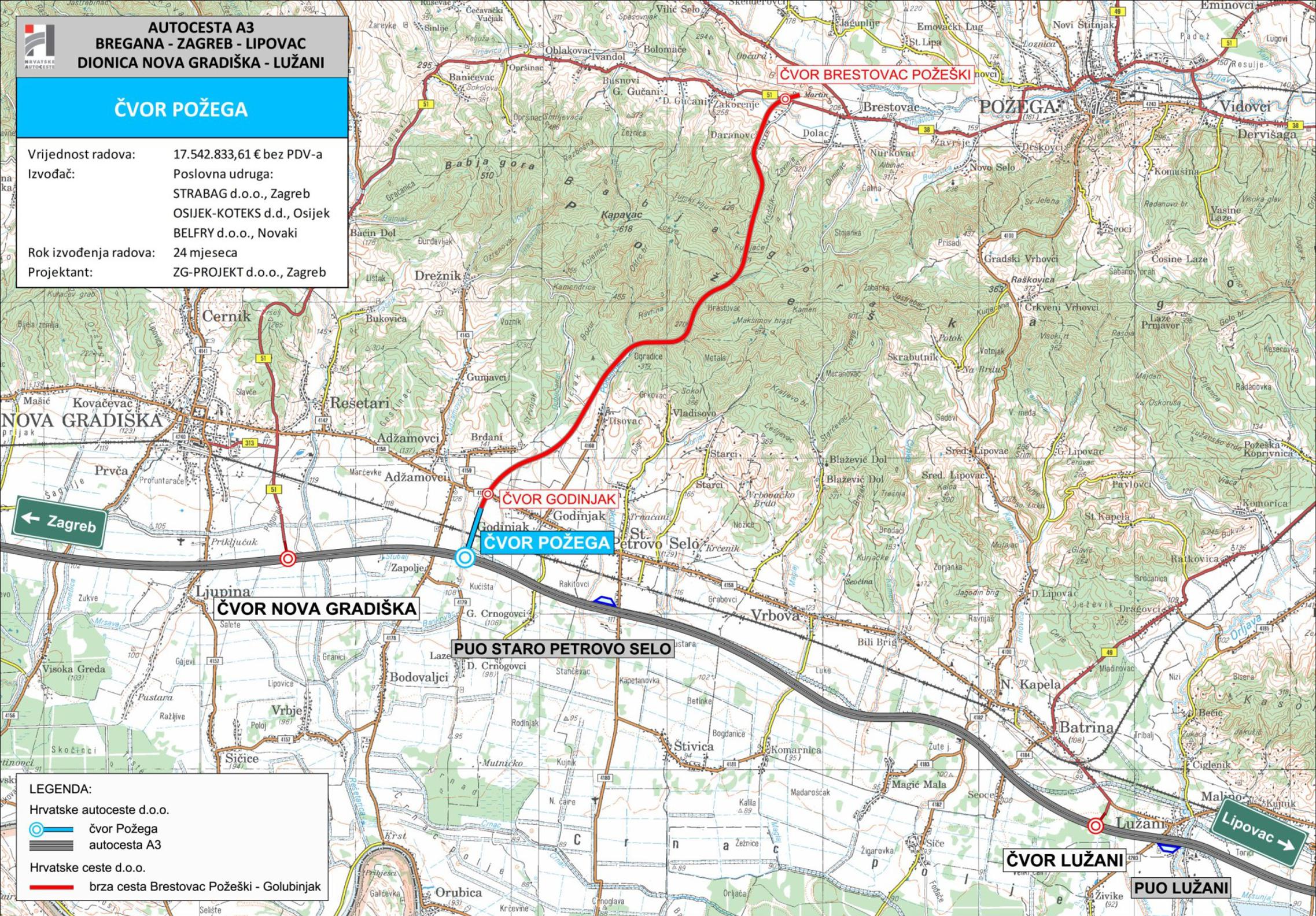 - Drago mi je da smo ponovno ovdje gdje se nedavno potpisao ugovor za izgradnju brze ceste dionice Brestovac Požeški - Čvorište Godinjak, projekt vrijedan 160 milijuna eura, koji predstavlja najveći cestovni projekt u Hrvatskoj danas. Uveli smo izvođača u posao, a da bi brza cesta bila u punoj funkciji, treba izgraditi Čvor Požega za koji se danas potpisuje ugovor u vrijednosti 17,5 milijuna eura i koji je u ingerenciji Hrvatskih autocesta – rekao je Butković.