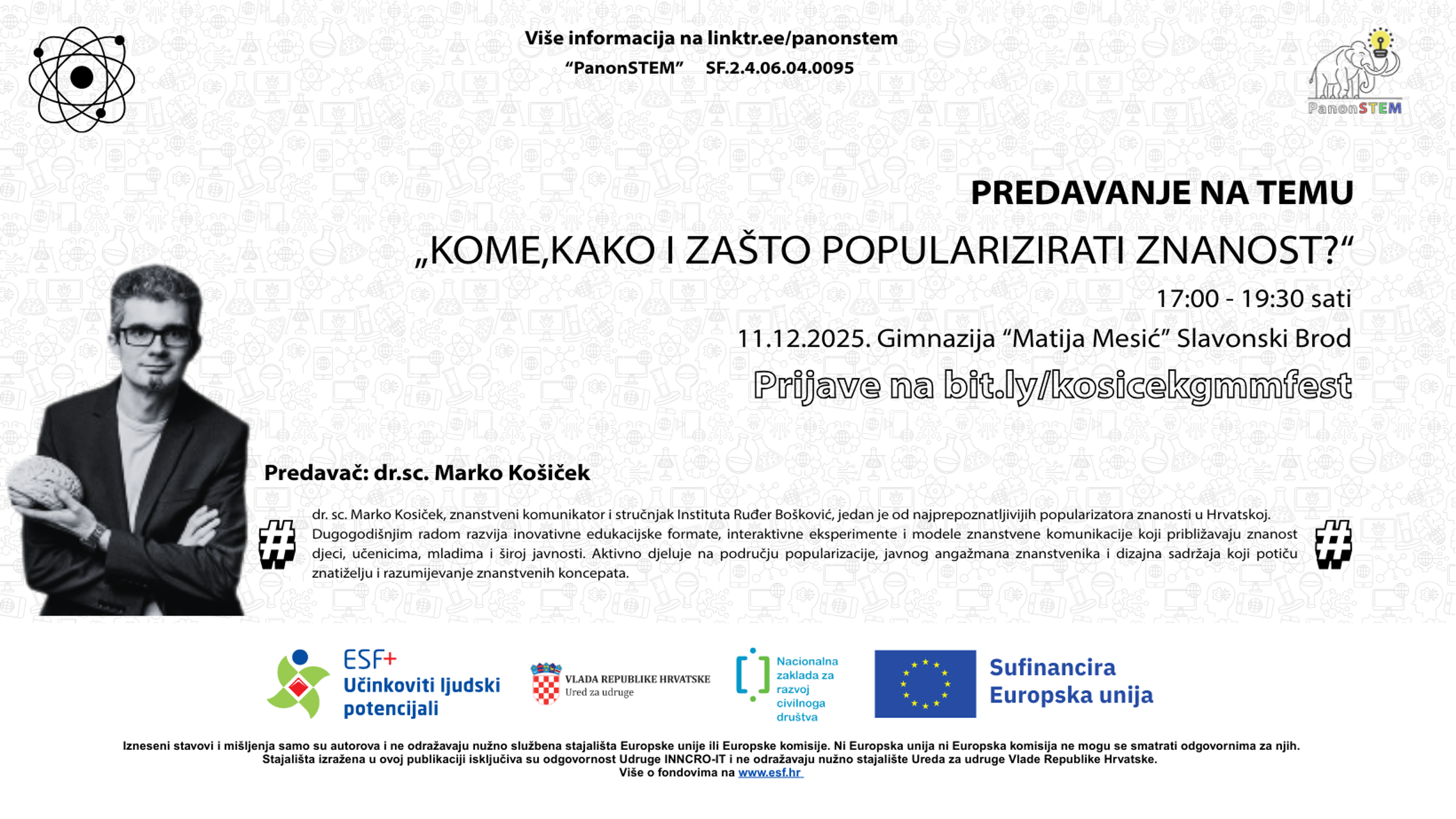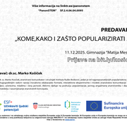 U sklopu GMM FEST(IVAL)-a 2025 u Slavonskom Brodu bit će održano i predavanje dr. sc. Marka Kosičeka, jednog od najistaknutijih hrvatskih popularizatora znanosti i stručnjaka Instituta Ruđer Bošković. Predavanje pod nazivom „Kome, kako i zašto popularizirati znanost?“ održat će se u četvrtak, 11. prosinca 2025., od 17 do 19.30 u prostoru Gimnazije „Matija Mesić“. Događaj je namijenjen nastavnicima, odgojno-obrazovnim djelatnicima, edukatorima, studentima i svim zainteresiranim građanima koji žele upoznati suvremene metode približavanja znanosti djeci, mladima i široj zajednici.