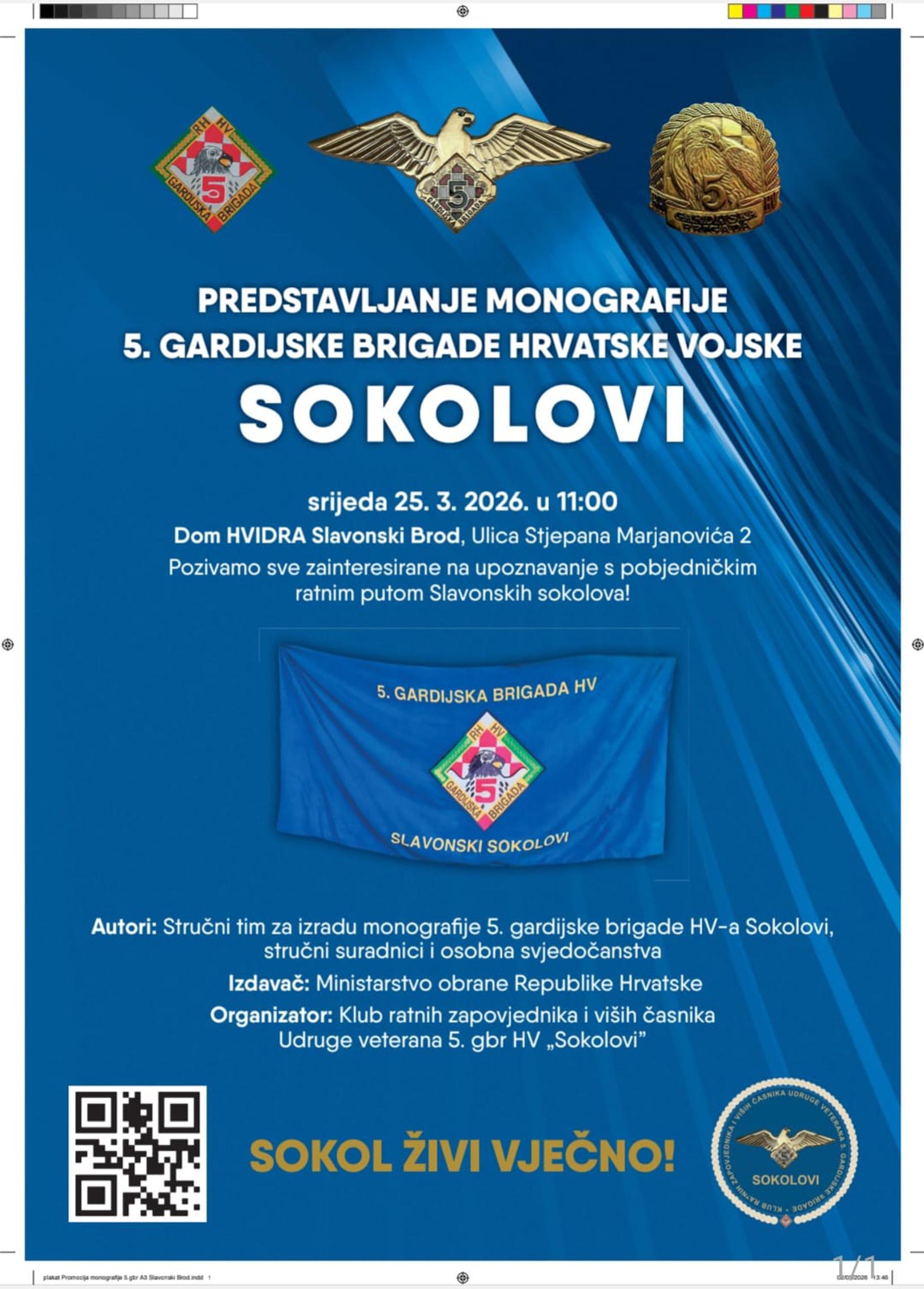 - Na temelju svega navedenog, izuzetna nam je čast pozvati Vas na svečano predstavljanje monografije 5. gardijske brigade Hrvatske vojske „SOKOLOVI” koja trajno bilježi pobjednički ratni put, hrabrost i doprinos jedne od značajnijih gardijskih postrojbi Hrvatske vojske.