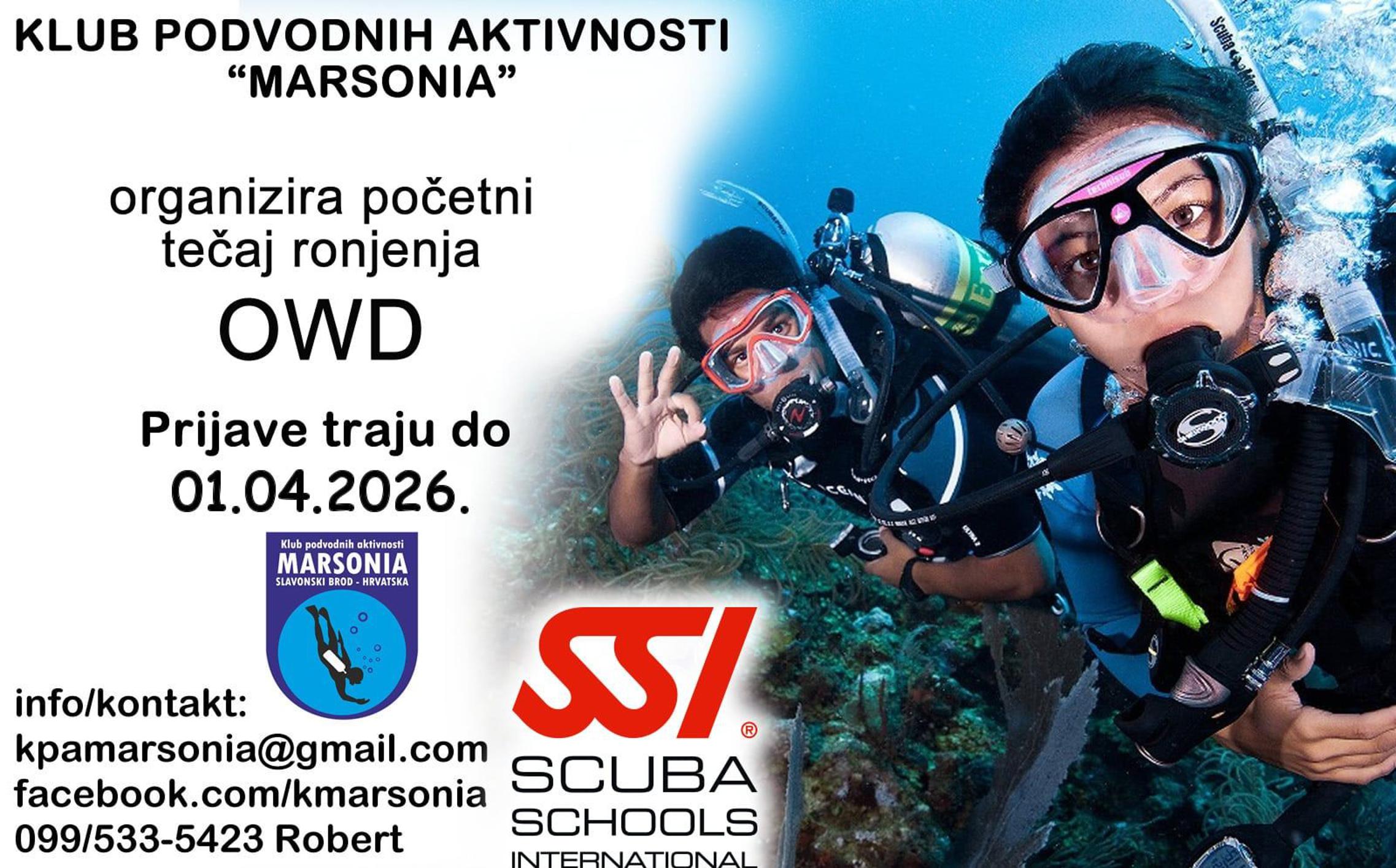 Riječ je o tečaju OWD (open water dive) prema standardima SSI (Scuba Schools International) koji se sastoji od teorijskog i praktičnog dijela i provodi se kroz četiri vikenda. Prijaviti se građani mogu do 1. travnja u 18 sati kada tečaj službeno počinje uvodnim sastankom svih prijavljenih polaznika u prostorijama Kluba podvodnih aktivnosti Marsonia (Slavonski Brod, Ivana Meštrovića 1). Tada mogu dobiti i sve detaljne informacije o terminima nastave i praktičnih vježbi, koje će voditi iskusni instruktori i voditelji ronjenja.
