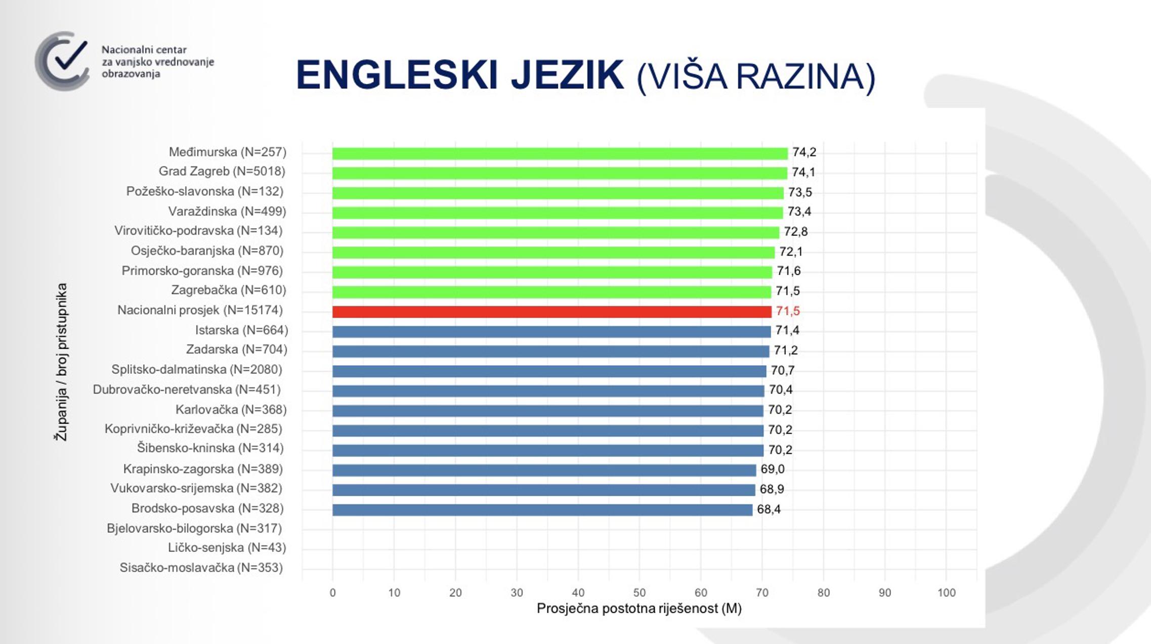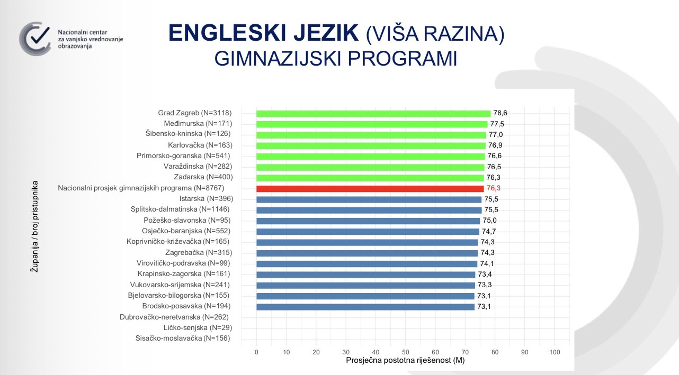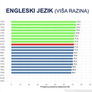 Engleski jezik više razine učenici u Brodsko-posavskoj županiji napisali su najlošije u Republici Hrvatskoj, s prosjekom od 68,4 posto, dok za strukovne škole rezultat nije zabilježen. Osnovna razina engleskog jezika također donosi razočaravajuće rezultate - samo je u jednoj kategoriji, osnovnoj razini za gimnazijalce, županija bila iznad državnog prosjeka: Brodsko-posavska županija ostvarila je 78,1 posto, dok je državni prosjek 76,1 posto.