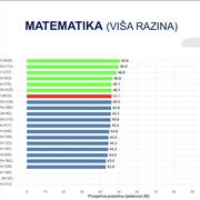 Gimnazijalci su više razine matematike napisali nešto bolje - 50,7 posto, što je i dalje znatno ispod državnog prosjeka od 53,3 posto - dok su nižu razinu riješili prosječno, s 42,6 posto. Rezultat više razine matematike za strukovne škole nije zabilježen, a nižu razinu strukovnjaci su riješili prosječno, uz 38 posto uspješnosti.