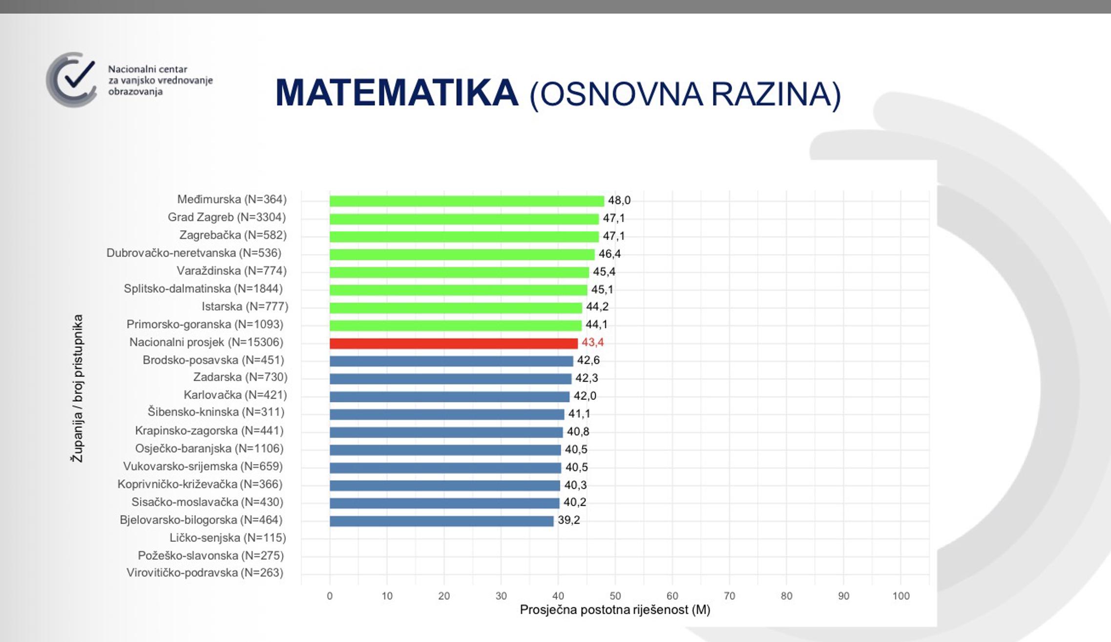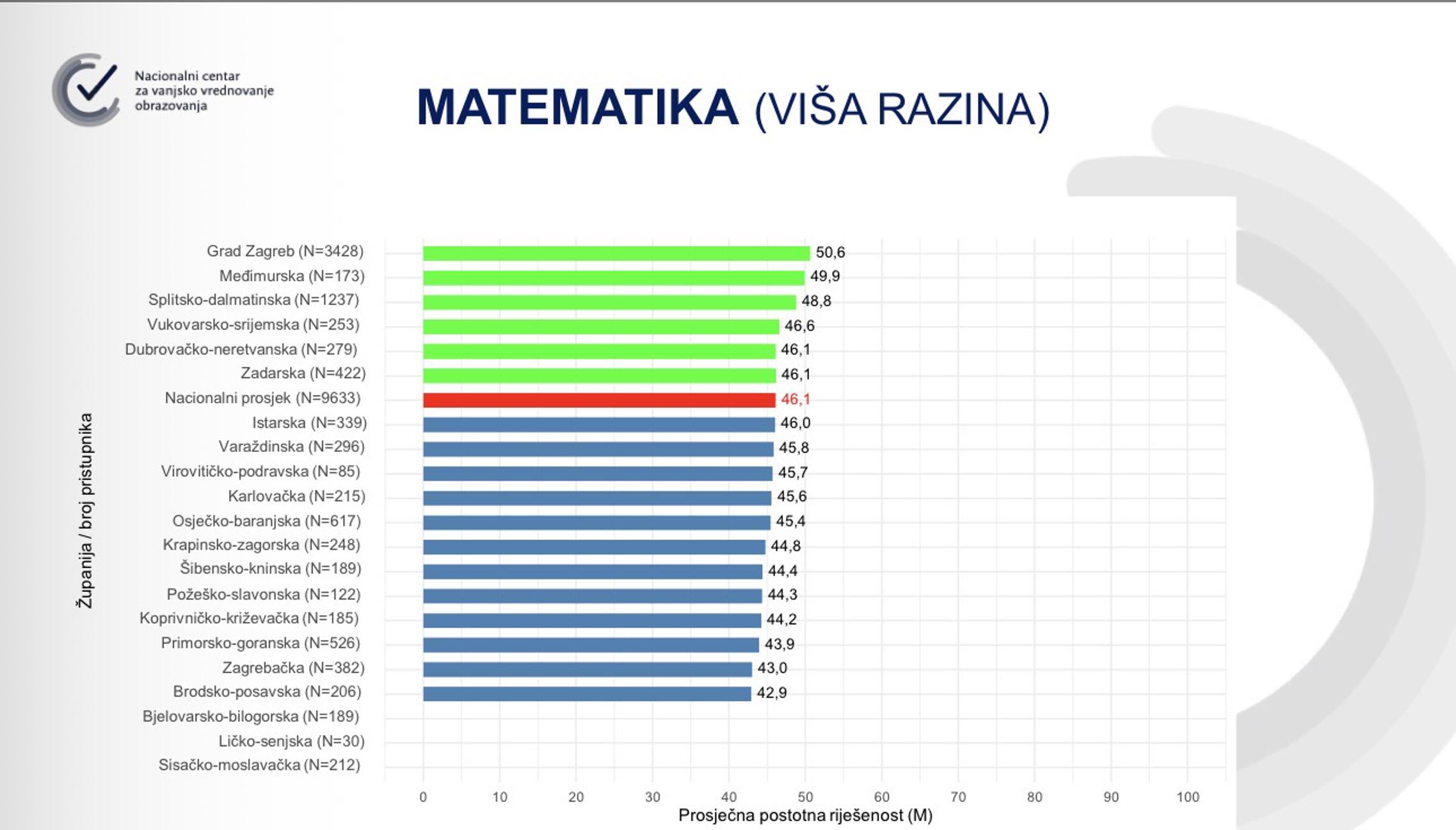 S matematikom se učenici Brodsko-posavske županije već godinama muče, a ove su godine završili na samom začelju državne ljestvice postotne riješenosti. Nacionalni prosjek više razine matematike iznosi 46,1 posto, dok su učenici Brodsko-posavske županije ostvarili tek 42,9 posto.