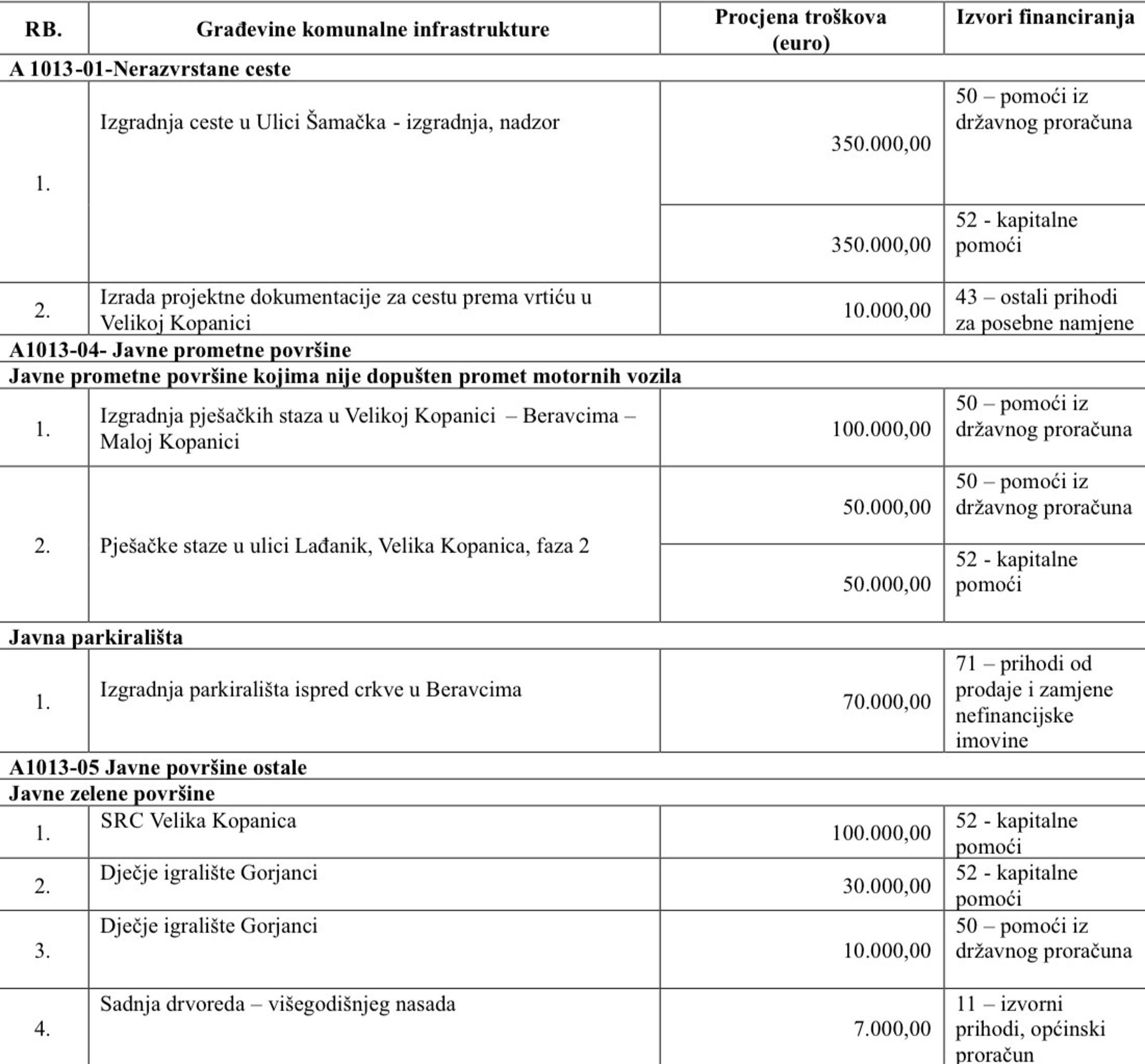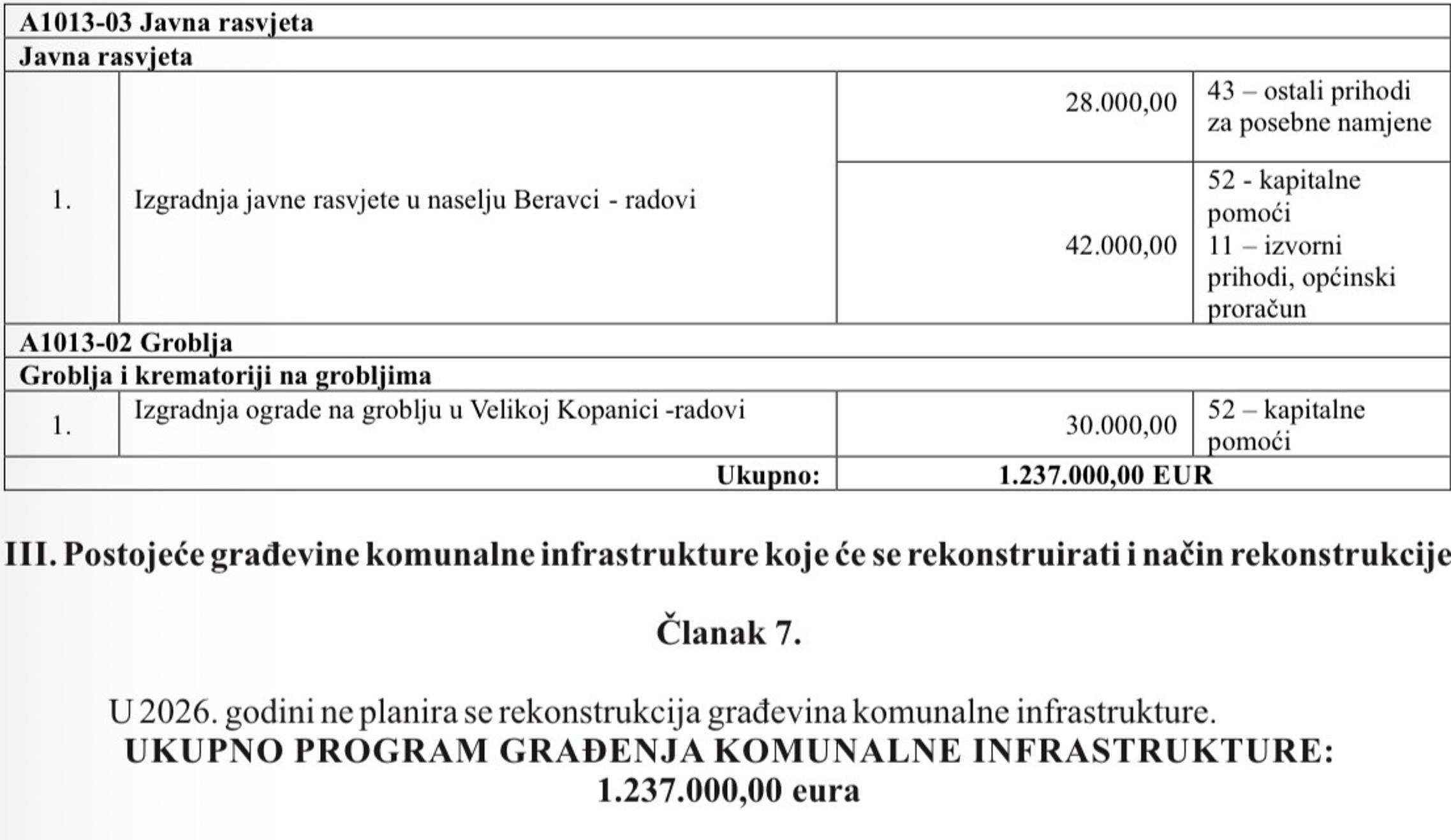 Najavljena je i izgradnja ograde na groblju u Velikoj Kopanici vrijedna 30 tisuća eura, a bit će izgrađena i javna rasvjeta u naselju Beravci. Sredstva za realizaciju bit će osigurana iz općinskog proračuna te državnih i kapitalnih pomoći. Program je započeo s primjenom od prvog dana 2026. godine.