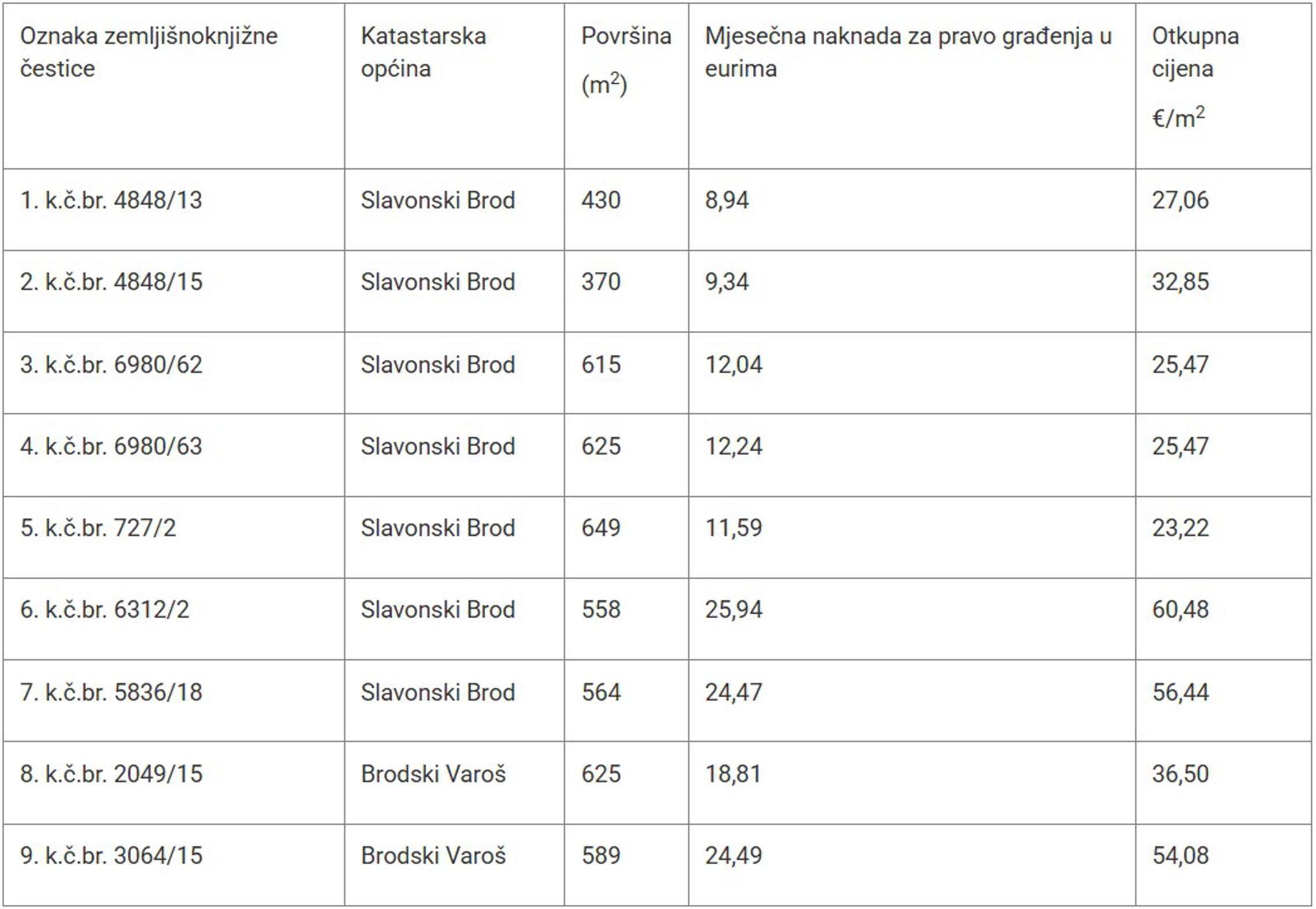 Sve točne informacije o lokaciji i površini parcela, mjesečnoj naknadi koju će plaćati obitelji koje je dobiju te otkupnoj cijeni po kvadratnom metru, moguće je saznati u nastavku (parcele poredane gornjim rasporedom).