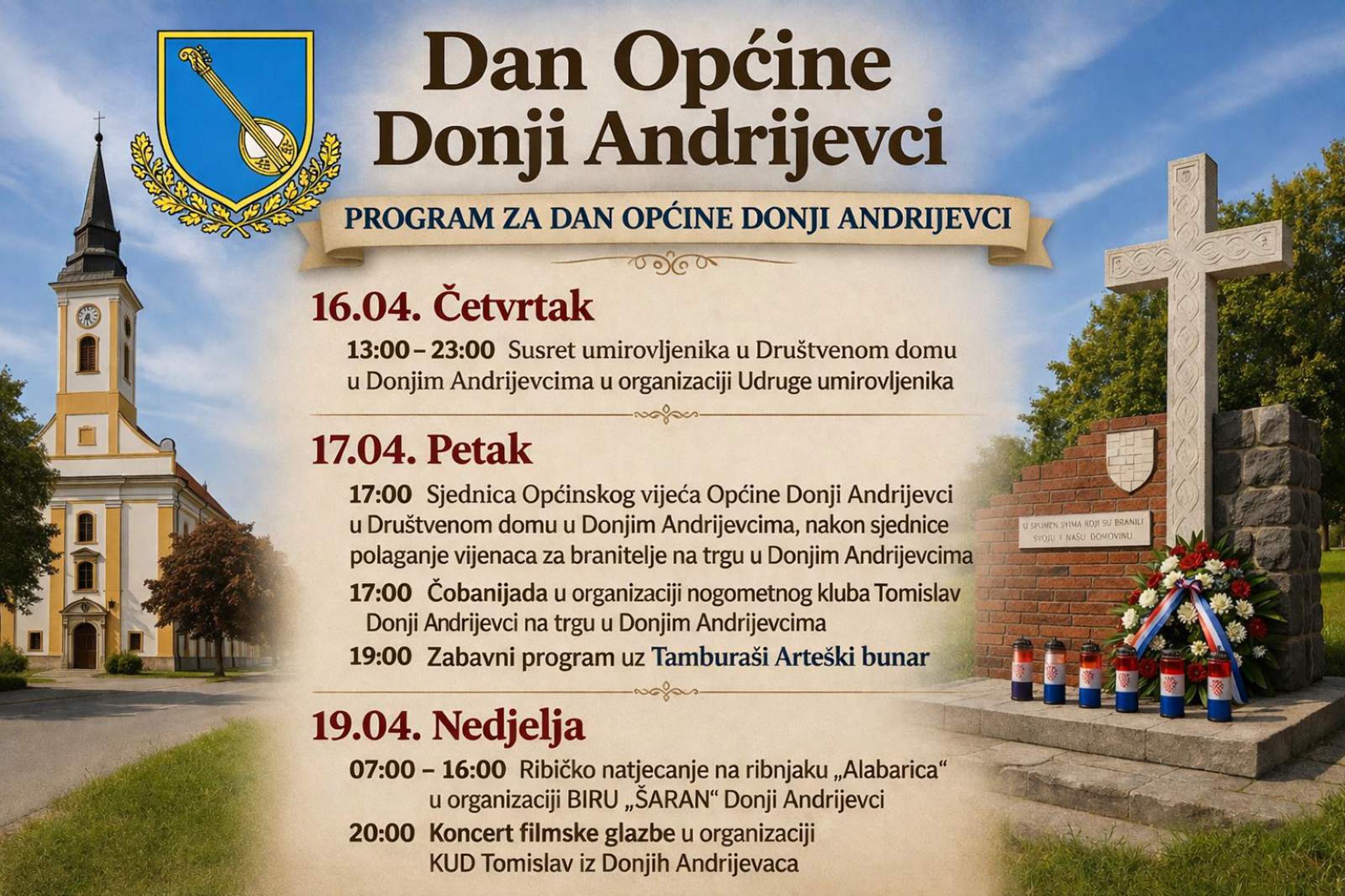 Načelnik općine Vedran Gavran donio je 14. travnja 2026. godine Odluku o odobrenim sredstvima za sufinanciranje manifestacije za Dan općine 2026. godine. Riječ je o značajnom iznosu od 30.500 eura koji je odobren Nogometnom klubu Tomislav Donji Andrijevci za organizaciju bogatog programa obilježavanja Dana Općine.