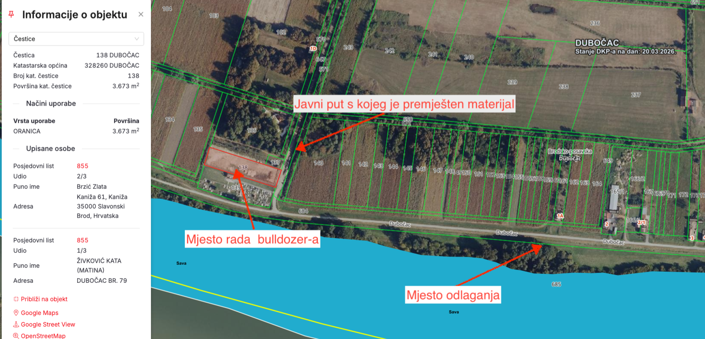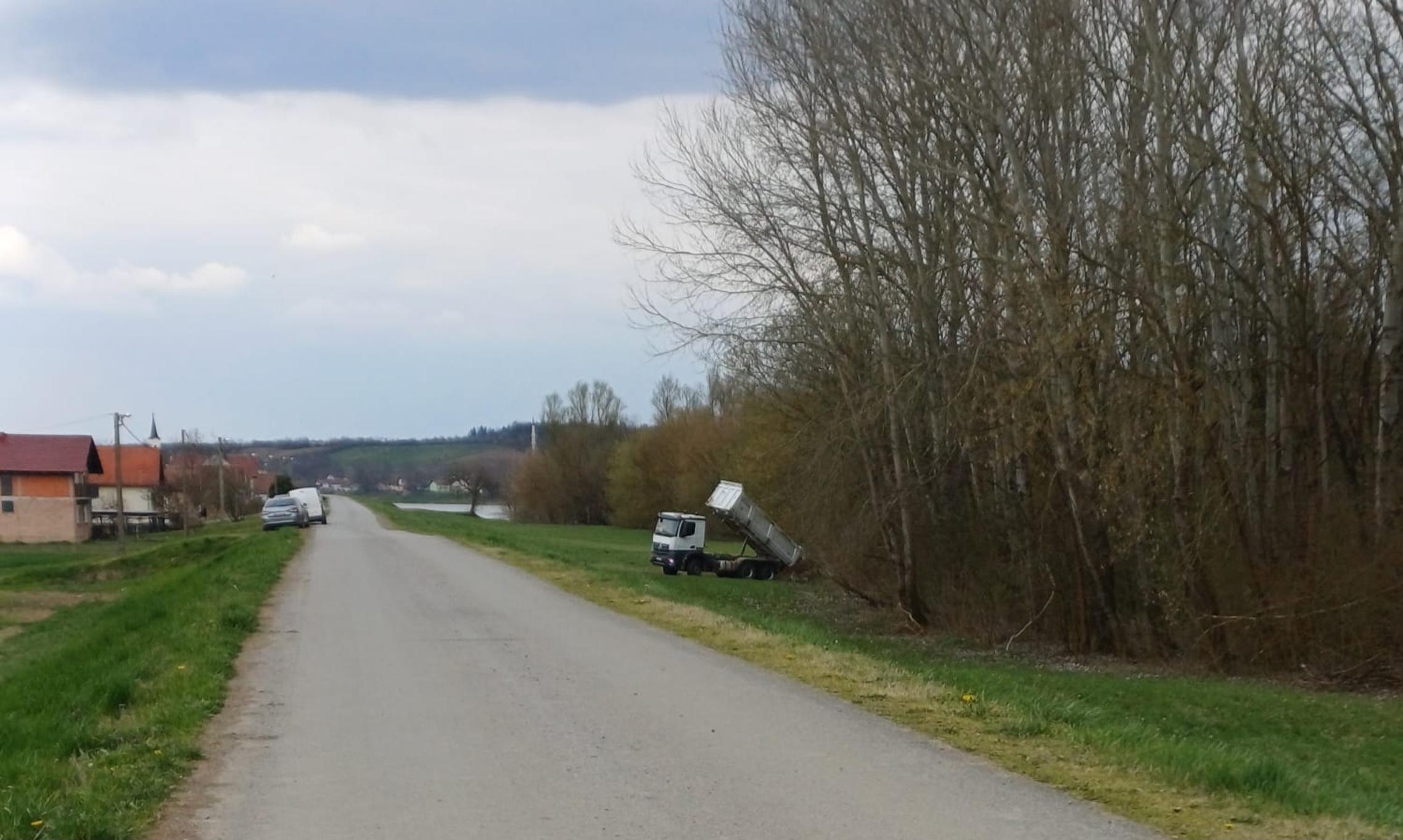 Materijal koji je rezultat tih privatnih radova (zemlja, kamenje, granje,...) neko je vrijeme stajao uz javni put. Sve dok ga u petak, 20. ožujka, netko od radnika Brodske Posavine (registracijska oznaka kamiona poznata redakciji), strojevima koji su tamo zbog javnih radova (plaćenih javnim sredstvima) nije utovario u kamion i ilegalno odložio uz rijeku Savu.