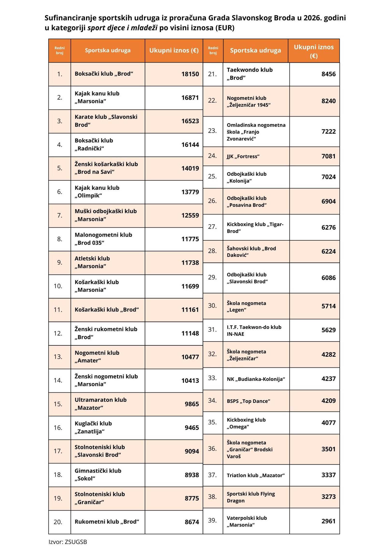 Od 346.000 eura namijenjenih sportu djece i mladeži u sportskim udrugama, među njih 39 najviše su dobili Boksački klub „Brod“ (18.150 eura), Kajak kanu klub „Marsonia“ (16.871 eura), Karate klub „Slavonski Brod“ (16.523 eura) i Boksački klub „Radnički“ (16.144 eura).