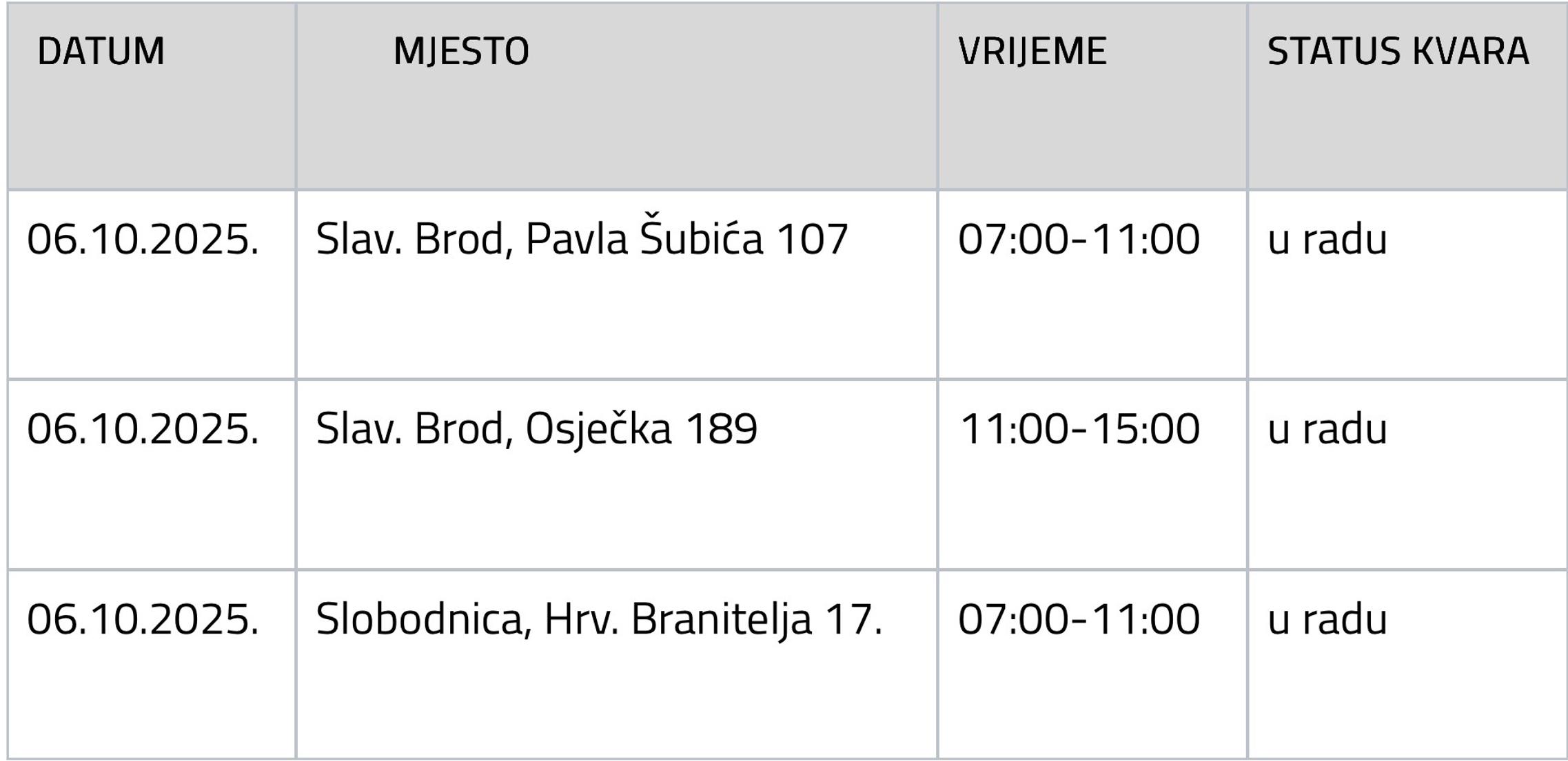 Zbog radova na otklanjanju kvarova na cjevovodu mogući su poremećaji u opskrbi pitkom vodom na sljedećim lokacijama: