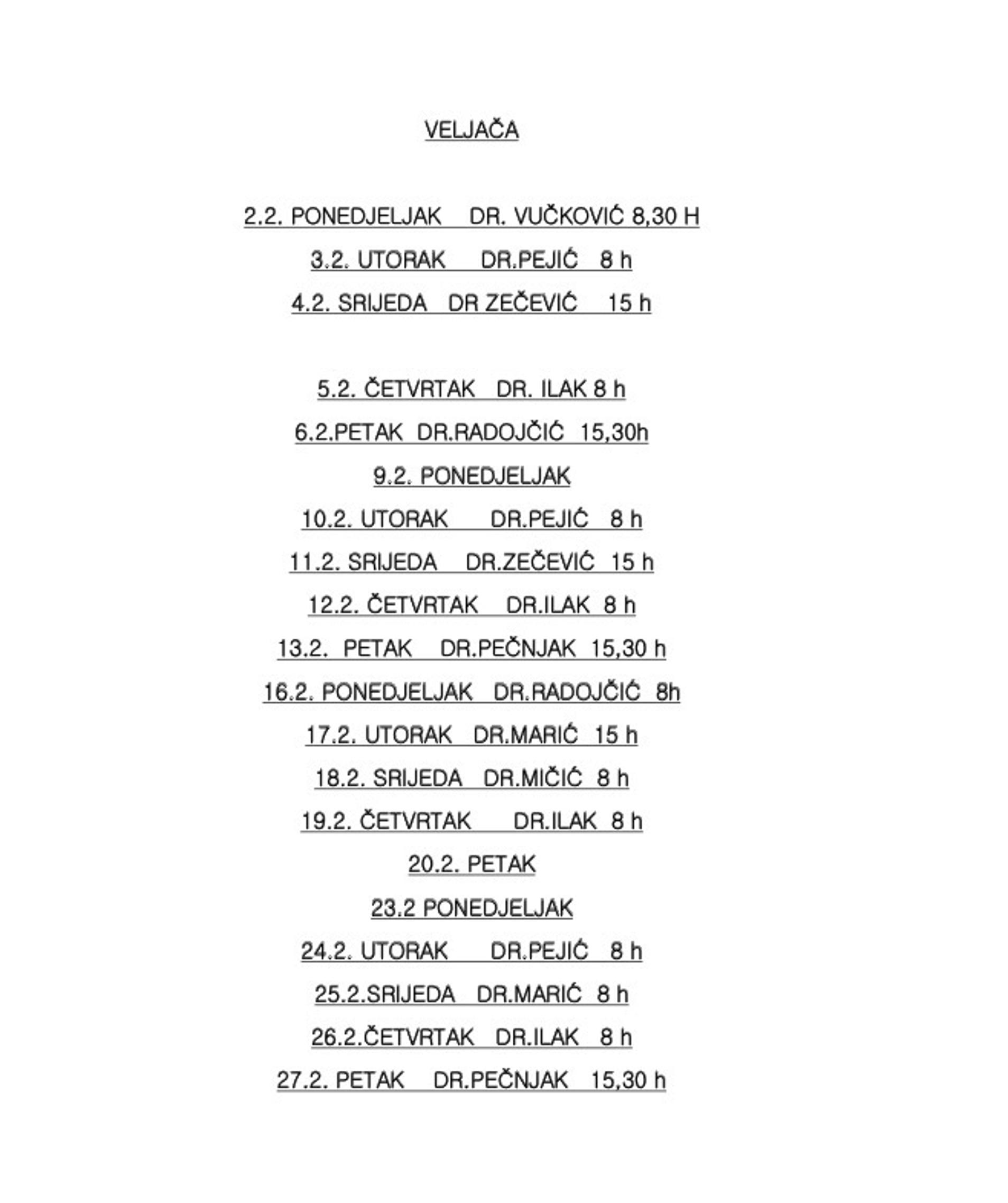 Tako će pedijatrijska ordinacija u prvom tjednu mjeseca raditi svih pet radnih dana - dok će u preostalim tjednima biti dostupna četiri od pet radnih dana. Najveći razmak između otvorenih termina iznosit će četiri dana, budući da ambulanta neće raditi u petak 20. i ponedjeljak 23. veljače.